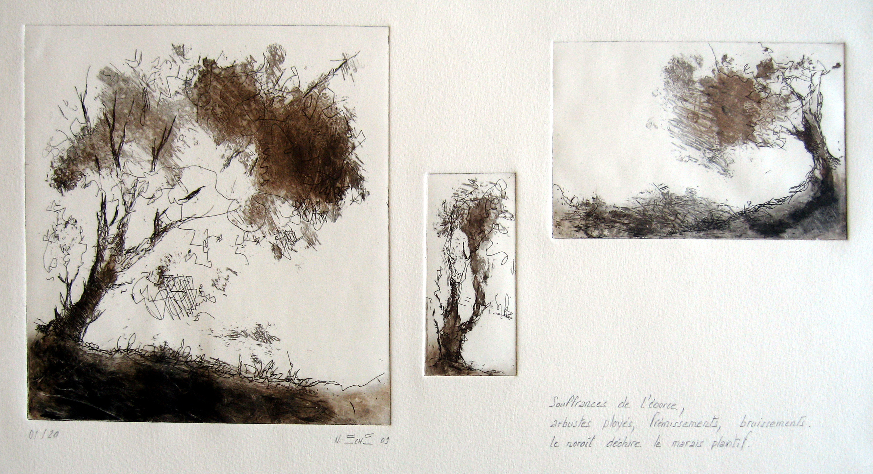 Estampe / 3 plaques de zinc / Pointe sèche et morsures ouvertes / (Souffrances de l’écorce, arbustes ployés, frémissements, bruissements. Le noroît déchire le marais plaintif)