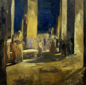 Les couleurs de Daoud participent à la fantasmagorie, elles se répandent en aplats verdâtres, en ombres livides et blêmes qui déversent une lumière ténébreuse, résolument angoissante. Les personnages de cet étrange opéra baroque déambulent dans une architecture qui les écrase, entre des colonnes s’ouvrant sur de vastes espaces où la nature elle-même est tumultueuse. Gageons que si l’artiste apporte, çà et là, le titre « onirisme » à ses oeuvres, cet onirisme provient de l’hallucination bien plus que de la béatitude.