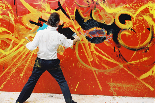 Le lyrique Mathieu s’abstrait.Mes vingt ans s’ennuyaient ferme face à Warhol et à Lichtenstein et je ne voyais dans leurs oeuvres que les innombrables Marilyn et les sempiternelles bulles de bandes dessinées. J’ai découvert depuis que leur art était une critique féroce de la société de consommation. Ah bon ? Ils ont fait don de leur immense fortune aux oeuvres ? Par contre, Mathieu m’enthousiasmait et je courais ses expositions, même s’il était éminemment mondain, même si son vrai nom était Georges Victor Mathieu d’Escaudoeuvres, même s’il était la représentation la plus aboutie de l’art officiel pompidolien. Le Pop Art est resté, Mathieu est oublié. Mais aujourd’hui je n’ai pas varié, je prends Mathieu pour un peintre de grand talent et les autres pour d’excellents commerciaux. Georges, vous permettez que je dise Georges, merci pour mes vingt ans.