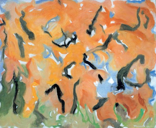 Son pseudonyme, il l’a choisi pour affirmer son amour du monde végétal. Rouvre est un vieux synonyme du chêne, le roi des arbres. Ami de Tal Coat et de Bazaine, Rouvre est le peintre de la fluidité. Ses feuillages sont liquides, ses rochers se mirent inlassablement dans une eau toujours présente, l’herbe est grasse et la terre spongieuse, sous une canopée moite, enfermant pour toujours l’humidité. J’aime ces huiles et ces aquarelles, à la limite de l’abstraction, qui nous invitent à l’imagination, écartant toute description destructrice de rêves. Je marche seul dans la forêt, les feuilles craquent, le soleil perce, parfois difficilement, la voute des branchages; je suis apaisé…Yves Rouvre m’accompagne.